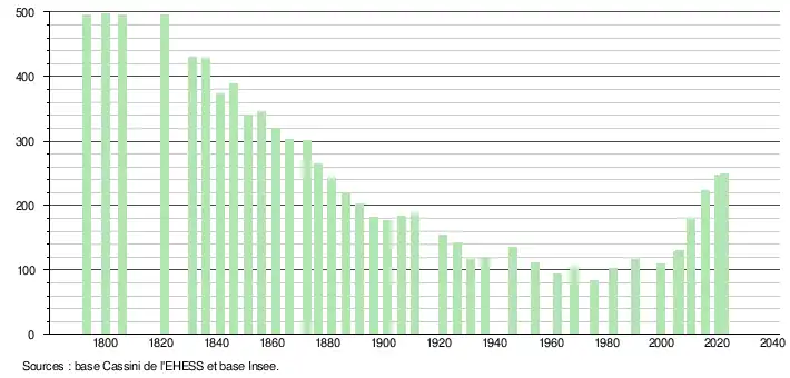 L'évolution du nombre d'habitants est connue à travers les recensements de la population effectués dans la commune depuis 1793. Pour les communes de moins de 10 000 habitants, une enquête de recensement portant sur toute la population est réalisée tous les cinq ans, les populations de référence des années intermédiaires étant quant à elles estimées par interpolation ou extrapolation[18]. Pour la commune, le premier recensement exhaustif entrant dans le cadre du nouveau dispositif a été réalisé en 2005[19].