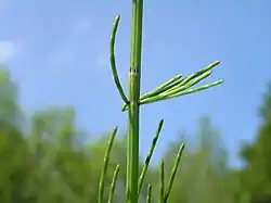 Les rameaux, placés en verticille, ont une section quadrangulaire. La gaine dentée correspondant aux feuilles porte de 6 à 12 dents[1].