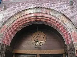 Dans les années 1990, la façade nord en briques rouge-orangées présente un grand portique à arc plein cintre, en briques et pierres, avec des portes en profond retrait. « Cet arc est supporté par trois colonnes sculptées, deux colonnes torsadées et une colonne centrale avec motif à chevrons, chacune avec un chapiteau de style byzantin[39] », et possède au-dessus un couronnement en pierres[37]. Les mots First Roumanian-American Congregation sont gravés en lettres capitales sur l'arc du portique[37].