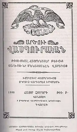 | Ardzvi Vaspourakan | Արծուի Վասպուրական | « L'Aigle du Vaspourakan » | Journal | 1855-1874 | Constantinople (1855-1858) Varagavank (1858-1864) Constantinople (1872-1874) |