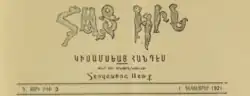| Azadamard | Ազատամարտ | « Combat pour la liberté » | Journal de la Fédération révolutionnaire arménienne | 1909-1914 | Constantinople | ![]() |