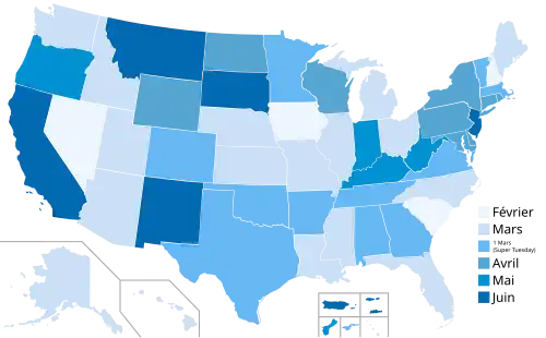 | Washington (district de Columbia) | Primaire fermée | 20 | 25 | 0 | 78,0 % | 16 | 23 | 39 | 76 704 | 20,7 % | 4 | 2 | 6 | 20 361 | ||||||