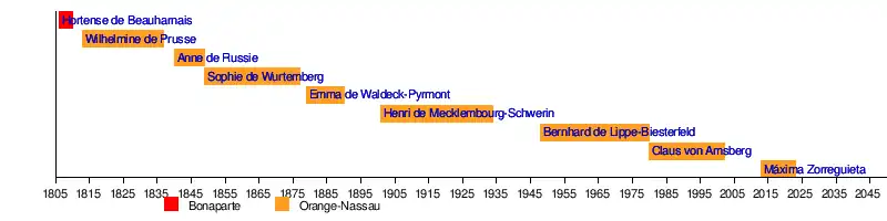 | Máxima Zorreguieta Née le à Buenos Aires | Depuis le (12 ans, 1 mois et 6 jours) | Willem-Alexander, roi des Pays-Bas | Famille Zorreguieta (fille de Jorge Zorreguieta) |