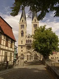 En 1179, la ville et la cathédrale ont été dévastées par les attaques furieuses du duc Henri le Lion. Dans le territoire de l'ancien duché de Saxe, la principauté-épiscopale se manifeste après la destitution de Henri par l'empereur Frédéric Barberousse l'année suivante. La construction de la cathédrale existante a commencé sur décision du chapitre au début du XIIIe siècle, en réponse à la réalisation de la cathédrale de Magdebourg. En 1315, l'évêque Albert Ier de Halberstadt, issu de la maison d'Anhalt, a acquis les domaines autour d'Aschersleben, lorsque son cousin le prince Othon II d'Anhalt-Aschersleben meurt sans héritier mâle.