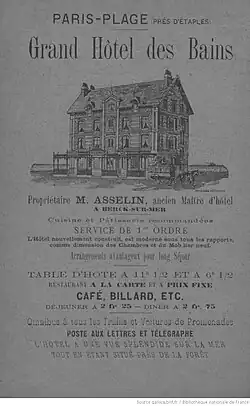 Le Grand hôtel des Bains est construit en 1892, sur les plans de l'architecte d'Amiens, Évrard Lesueur, l'édifice est en briques et marbre de Marquise, rehaussée de faïences décoratives. Il est la propriété de M. Asselin, ancien propriétaire de la correspondance de Berck à Verton[ÉL 4] et directeur de l'hôtel de France à Berck, mort le , à Paris-Plage, dans sa quatre-vingt-onzième année[ÉL 5],[AD62 1].