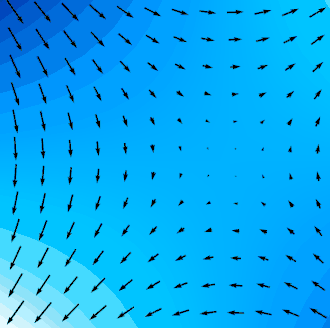 Cela signifie que l'action réduite « pilote » la particule. En outre, l'action est un champ de potentiel, c'est-à-dire qu'une valeur est définie en tous points de l'espace (sur la figure ci-contre, plus la couleur est bleu clair, plus l'action est importante) ; par conséquent, le gradient de l'action définit un champ de vitesses (les flèches sur la figure ci-contre). L'action réduite ne définit pas seulement une trajectoire unique mais un flot de trajectoires qui sont orthogonales aux surfaces ; c'est-à-dire . Il suffit de donner une position initiale à une particule, alors sa trajectoire est donnée par le champ de vitesses[8].