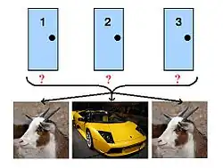 • Soient trois portes, l'une cache une voiture, les deux autres une chèvre. Les prix sont répartis par tirage au sort.