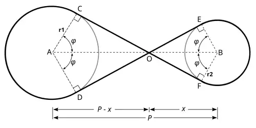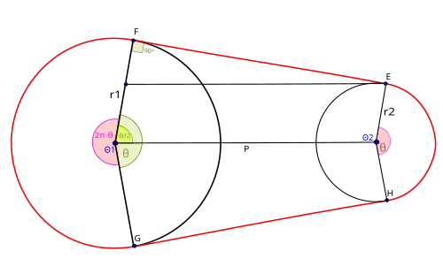 Il est clair que les triangles ACO et ADO sont des triangles rectangles isométriques, de même que les triangles BEO et BFO. De plus, les triangles ACO et BEO sont semblables. Donc les angles CAO, DAO, EBO et FBO sont tous égaux. En désignant cet angle par (mesuré en radians), la longueur de la ceinture est