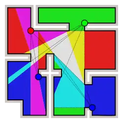 Une 3-coloration des sommets d'un polygone triangulé. Les sommets d'une même couleur donnent un ensemble de gardiens. Les sommets bleus par exemple fournissent un ensemble non-optimal de 3 gardiens. Il est possible de n'avoir que 2 gardiens, en les plaçant au nœud bleu en haut à gauche, et au nœud vert en bas.