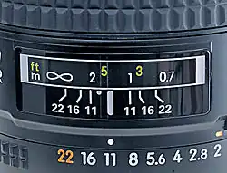 Si l'objectif dispose d'une échelle de profondeur de champ, comme illustré ci-dessus, le photographe peut s'en servir pour prévoir la profondeur de champ : de part et d'autre du repère qui indique la distance de mise au point (réglée entre 1 et 2 m sur l'illustration), des gravures symétriques portant des valeurs de diaphragme, 11, 16 et 22, indiquent les limites de la profondeur de champ. Pour une ouverture réglée sur f/11, comme l'indique la bague de réglage de l’ouverture, le premier plan net sera situé à 1 m et le dernier plan net à 2 m. Il est intéressant d'observer ensuite l'augmentation de la profondeur de champ lorsque l'ouverture diminue, jusqu'à f/22 pour cet objectif.