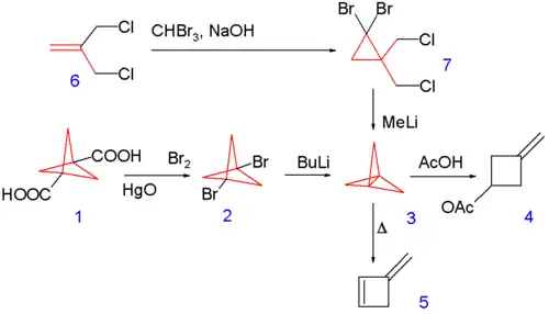 une autre voie de synthèse commence avec l'addition du dibromocarbène sur la double liaison du 3-chloro-2-(chlorométhyl)propène 1.6 suivie par une déprotonation avec le méthyl lithium et une substitution nucléophile dans 1.7[5] qui n'est pas isolé mais gardé en solution à −196 °C.