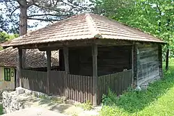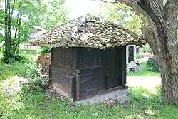 L'entrepôt (en serbe : magaza), situé sur un terrain plat, se trouve à l'écart des autres bâtiments. De plan rectangulaire, il est construit sur de hautes fondations en pierres concassées. Les murs, en bois, sont constitués de poutres et de piliers. Du côté de l'entrée, un porche-galerie est porté par deux piliers en chêne. Le toit à quatre pans est recouvert de tuiles[2].