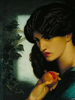 Dante Gabriel Rossetti, Proserpine, (1874), détail évoquant l'acte II de la pièce: la déesse tient dans la main gauche la grenade dont elle a mangé quelques pépins.