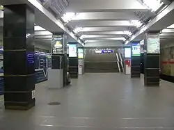Elle dispose de deux halls souterrains : situés au nord et au sud du quai ils ont une configuration semblable avec un passage souterrain piétonnier relié à la surface par quatre bouches équipées d'escaliers fixes, et une relation avec le quai situé à 8 mètres de profondeur par un court tunnel en pente équipé d'un escalier mécanique[3].