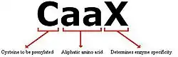 Les motifs de type « boîte CaaX » sont les sites de prénylation des protéines les plus courants, les groupes prényle se liant aux résidus de cystéine des boîtes CaaX[2],[3]. Le motif CaaX est composé de quatre résidus d'acides aminés : C représente une cystéine ; a représente un acide aminé aliphatique quelconque ; et X représente un résidu dont la nature détermine le type de prénylation devant survenir sur la protéine : s'il s'agit d'un résidu d'alanine, de méthionine, de sérine ou de glutamine alors la protéine sera farnésylée par une farnésyltransférase (en), tandis que s'il s'agit d'un résidu de leucine alors la protéine sera géranylgéranylée par une géranylgéranyltransférase de type 1[3],[4]. Ces deux enzymes sont semblables, chacune contenant deux sous-unités[6].