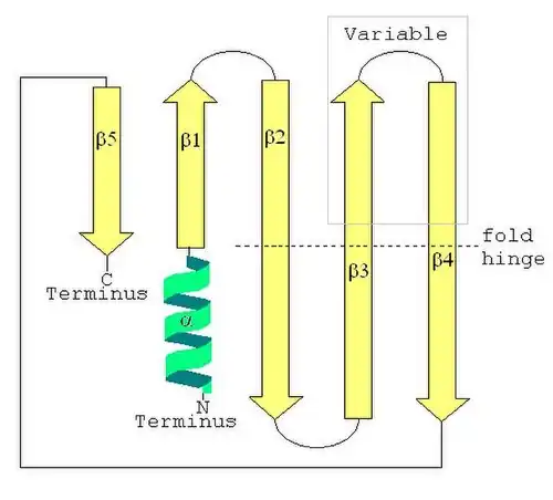 La structure secondaire d'une protéine LSm est un feuillet de cinq brins anti-parallèles β, avec les brins identifiés à partir de l'extrémité N-terminale vers l'extrémité C-terminale par β1, β2, β3, β4, β5. La séquence de motifs Sm1 correspond aux brins β1, β2, β3 et la séquence Sm2 correspond aux brins β4 et β5. Les quatre premiers brins β sont adjacents entre eux, mais β5 est adjacent à β1, transformant la structure d'ensemble en un court cylindre. Cette topologie structurelle est décrite comme 51234. De courte longueur (deux à quatre tours de spire) l'hélice α N-terminale est également présente dans la plupart des LSm. Les brins β3 et β4 sont courts dans certaines LSm et séparés par un portion non structurés de longueur variable. Les brins β2, β3 et β4 sont courbés à 120° en leur milieu, les coudes correspondant souvent à la présence de glycine et les chaînes latérales internes au cylindre à des résidus hydrophobes: valine, leucine, isoleucine et méthionine.