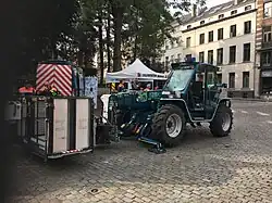 Un tracteur et sa remorque aux anciennes couleurs de la protection civile lors des démonstrations du 21 juillet à Bruxelles.