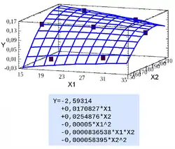 Pour simplifier, on supposera raisonnablement que les termes d'ordre 3, en T2·C, T2·m, C2·T, C2·m, T·m2 et C·m2 sont négligeables par rapport aux termes du premier ordre, ce qui revient à dire que les coefficients b11 à b16 sont nuls. En général, le terme en T·C·m est aussi négligeable.