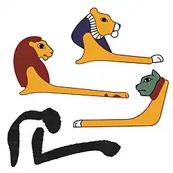 Il représente la partie antérieur (protomé) d'un lion (Panthera leo) couché. La crinière est originellement généralement bleu puis verte mais elle devient rouge sous la XIXe dynastie tandis que la patte a tendance à s'allonger. À l'époque ramesside (comme dans le tombeau de Néfertari) il représente parfois une lionne, sans crinière avec le visage vert à l'image de la déesse Sekhmet. Il est translittéré ḥȝt.