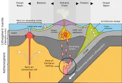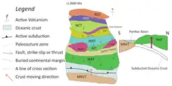 Certains terranes, comme le Wabigoon occidental, sont formés à partir de la formation d'un arc océanique. Un arc océanique est formé d'une chaîne de volcans émergeant au-dessus et parallèlement aux zones de subduction. En raison de la tectonique de la planète, les croûtes continentales et océaniques concernées sont entrées en collision avant 2,70 Ga[1]. La croûte océanique, en raison de sa plus grande densité, a subducté sous la croûte continentale et a fondu dans le manteau, ce qui a généré plus de magma, dont une énorme quantité s'est alors élevée, a percé à travers la croûte au-dessus et a créé du volcanisme. Les matériaux solides de l'éruption continue se sont refroidis et se sont accumulés autour, formant une chaîne de volcans en forme d'arc[12].