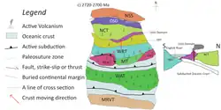 | 2 690 Ma | Orogenèse shebandowanienne | Le terrane de Wawa-Abitibi s'est déplacé vers le nord pour entrer en collision avec le craton en croissance[1] |
