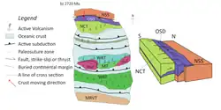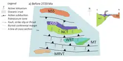 Avant 2 720 Ma, il y avait de nombreux fragments de microcontinents que des croûtes océaniques en forme de conduits à tendance E-O (avec une étendue inconnue) séparent[65]. Au cours de 2 720 Ma, une subduction active le long du Superterrane Nord Supérieur et du Terrane Nord Caribou a provoqué la dérive vers le sud du premier. Au fil du temps, il a uni le Superterrane de Nord Caribou et confiné le domaine d'Oxford-Stull, qui contient des assemblages de roches liés à la marge continentale et à la croûte océanique[65],[66]. La combinaison du Superterrane du Nord Supérieur et du Superterrane du Nord Caribou par subduction a marqué le début de la formation du Craton du Supérieur. Le mouvement vers le sud du Superterrane du Nord Supérieur vers le Superterrane du Nord Caribou entraîné par l'activité de subduction est mis en lumière par le magmatisme lié à l'arc dans le domaine d'Oxford-Stull de 2 775 à 2 733 Ma[66] et la zone de cisaillement sud-nord au contact entre les deux terranes[67]. La zone de suture de la subduction est supposée être la marge de la faille North Kenyon[66]. L'amarrage du Superterrane supérieur nord est rendu évident par la présence des zircons détritiques âgés de plus 3,5 Ga, trouvés dans des roches sédimentaires synorogéniques (formées lors d'un événement orogénique) âgés de moins de 2,711 Ga[66]. L'ancrage a également initié un volcanisme dont on retrouve les roches shoshonitiques à 2 710 Ma, et le rétrécissement régional, dû à un plissement et une foliation pour former des zones de cisaillement latérales droites orientées N-O[65],[66].