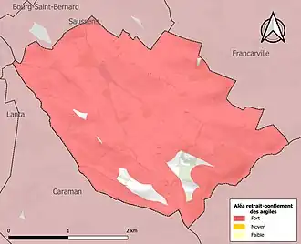 Le retrait-gonflement des sols argileux est susceptible d'engendrer des dommages importants aux bâtiments en cas d’alternance de périodes de sécheresse et de pluie. 95,1 % de la superficie communale est en aléa moyen ou fort (88,8 % au niveau départemental et 48,5 % au niveau national). Sur les 65 bâtiments dénombrés sur la commune en 2019, 65 sont en aléa moyen ou fort, soit 100 %, à comparer aux 98 % au niveau départemental et 54 % au niveau national. Une cartographie de l'exposition du territoire national au retrait gonflement des sols argileux est disponible sur le site du BRGM[22],[Carte 3].