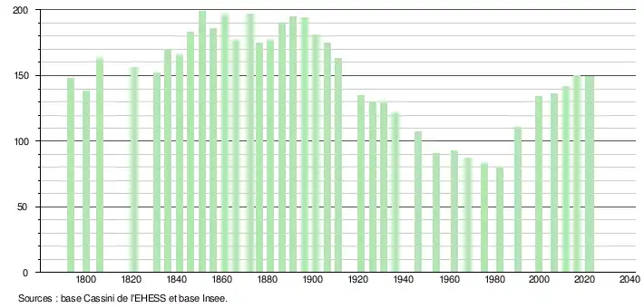 L'évolution du nombre d'habitants est connue à travers les recensements de la population effectués dans la commune depuis 1793. Pour les communes de moins de 10 000 habitants, une enquête de recensement portant sur toute la population est réalisée tous les cinq ans, les populations de référence des années intermédiaires étant quant à elles estimées par interpolation ou extrapolation[27]. Pour la commune, le premier recensement exhaustif entrant dans le cadre du nouveau dispositif a été réalisé en 2006[28].
