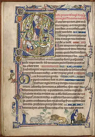 Le manuscrit contient 131 folios et il manque sans doute 19 folios qui ont été détachés à une période indéterminée. Les psaumes sont alternativement écrits en latin et en français. Le latin se trouve sur la page de gauche, écrit dans une encre de couleur noir, tandis que le français se trouve sur la page de droite, en rouge. Les psaumes en latin sont décorés de scènes de bas de page illustrant l'Ancien Testament, alors que ceux en français sont décorés de scènes du bestiaire et de motifs héraldiques. Le début des principales divisions du psautier sont marquées par des grandes lettrines historiées et des scènes de bas de page racontant les épisodes de la vie de David. Il ne reste cependant que 9 des 20 folios d'incipits qui devaient exister à l'origine. Le manuscrit contient par ailleurs 238 lettrines et bas de page illustrant l'Ancien Testament, de la Genèse au tout début de l'histoire de David. Les épisodes évoqués rappellent ceux déjà présents dans les bibles moralisées de l'époque. Le texte en français contient de son côté des lettrines décorées de blasons et des scènes de bas de page avec un bestiaire pour les 77 premiers psaumes. Certains animaux semblent associés à des psaumes spécifiques : ils renvoient ainsi à des qualités morales mises en valeur par le livre. Il s'agit d'un des très rares livres à effectuer une telle association entre psaume et animaux. Il ne se retrouve par la suite que dans le psautier de la reine Marie[3].