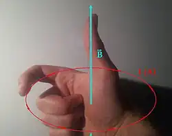 Un vecteur axial indique donc la direction de l'axe de rotation. Mais cela ne suffit pas : il faut aussi indiquer dans quel sens on tourne. Orienter l'espace, c'est indiquer quel est le sens positif de rotation. Pour cela, on utilise une convention[7] indépendante de tout repère : le sens positif de rotation autour de l'axe défini par le vecteur est obtenu en utilisant la règle du tire-bouchon de Maxwell. Ce sens positif de rotation est pour l'espace ce que le sens trigonométrique est pour le plan. D'ailleurs, si l'on considère le vecteur orthogonal au plan trigonométrique et orienté vers l'avant, cette convention redonne le sens trigonométrique. Comme c'est la main droite qui est utilisée (la main gauche donnerait le sens contraire), on dit que l'espace physique est orienté à droite. Cette convention est équivalente à la règle de la main droite qui permet de définir l'orientation d'un repère et par la suite l'orientation de l'espace. Le choix d'une orientation de l'espace est indispensable pour définir le produit vectoriel.
