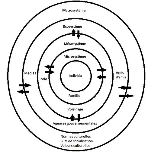 - Le macrosystème : Cette sphère est la couche la plus englobante du système écologique. Elle représente les normes culturelles, les buts de socialisation et les valeurs propres à une culture donnée[3].
