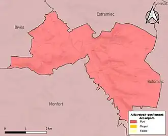 Le retrait-gonflement des sols argileux est susceptible d'engendrer des dommages importants aux bâtiments en cas d’alternance de périodes de sécheresse et de pluie. La totalité de la commune est en aléa moyen ou fort (94,5 % au niveau départemental et 48,5 % au niveau national). Sur les 78 bâtiments dénombrés sur la commune en 2019, 78 sont en aléa moyen ou fort, soit 100 %, à comparer aux 93 % au niveau départemental et 54 % au niveau national. Une cartographie de l'exposition du territoire national au retrait gonflement des sols argileux est disponible sur le site du BRGM[22],[Carte 3].
