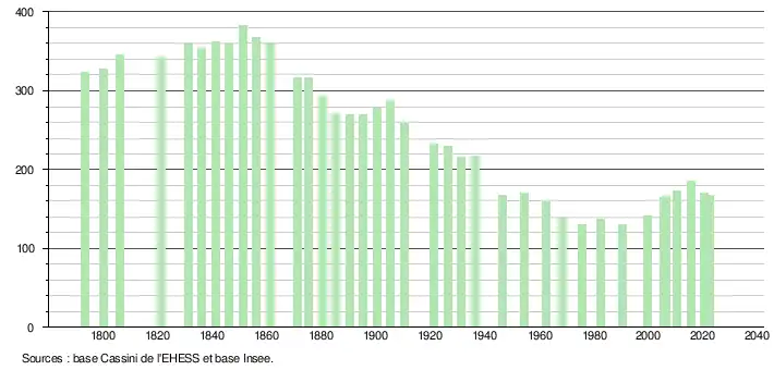 L'évolution du nombre d'habitants est connue à travers les recensements de la population effectués dans la commune depuis 1793. Pour les communes de moins de 10 000 habitants, une enquête de recensement portant sur toute la population est réalisée tous les cinq ans, les populations de référence des années intermédiaires étant quant à elles estimées par interpolation ou extrapolation[14]. Pour la commune, le premier recensement exhaustif entrant dans le cadre du nouveau dispositif a été réalisé en 2005[15].