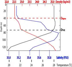 Le mélange par turbulence, produit par les vents et les vagues, transfère la chaleur vers le bas à partir de la surface. Dans les basses et moyennes latitudes, cela crée une couche de mélange de l'eau en surface de température presque uniforme, qui peut être épaisse de quelques mètres jusqu'à plusieurs centaines de mètres de profondeur. En dessous de cette couche de mélange, à des profondeurs de 200 à 300 m dans l'océan ouvert, la température commence à diminuer rapidement vers le bas jusqu'à environ 1000 m. La couche d'eau à l'intérieur de laquelle le gradient de température est le plus élevé est appelée la thermocline permanente[6]. La différence de température à travers cette couche peut être aussi élevée que 20 °C, en fonction de la latitude. La thermocline permanente coïncide avec un changement dans la densité entre les eaux de surface de faible densité et les eaux de fond denses. La région de changement de densité rapide est appelée la pycnocline, et celle-ci agit comme une barrière à la circulation verticale de l'eau ; ainsi, elle affecte également la distribution verticale de certaines substances chimiques qui jouent un rôle dans la biologie des mers. Les forts gradients de température et de densité peuvent également agir comme une restriction aux mouvements verticaux des animaux[7].