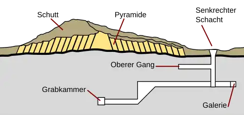 La chambre funéraire du roi est située à 26 m sous terre, de forme presque carrée, avec une base de 3,63 × 2,65 m et un plafond de 3 m[6]. La chambre funéraire ne contenait aucune trace de sarcophage, ce qui, avec l'absence d'artefacts dans la galerie, laisse présager la mort prématurée du roi[6].