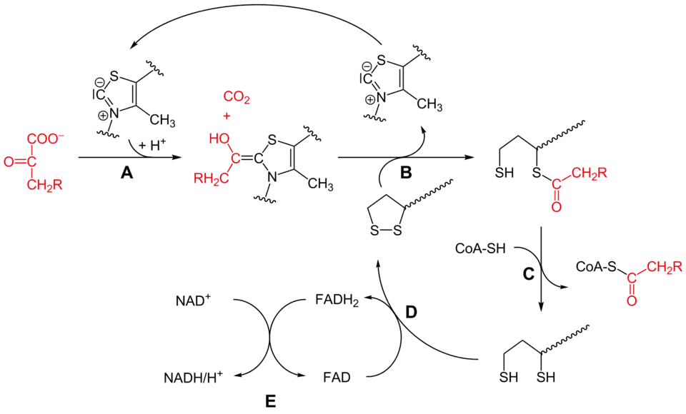 La forme de résonance ylure de la thiamine pyrophosphate (TPP) commence par attaquer la cétone électrophile du pyruvate. L'intermédiaire β-alcoolate se décarboxyle par la suite en un énol déprotoné sur l'atome de carbone pour former un dipôle 1,3 stabilisé avec un atome d'azote chargé positivement dans l'hétérocycle de la thiamine. Ce dipôle 1,3 est acétylé par le lipoamide lié à un résidu de lysine de la dihydrolipoamide S-acétyltransférase (E2).