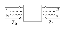 Les paramètres S (pour scattering, diffusion) sont écrits dans une approche différente. Ici on considère, comme illustré, le quadripôle placé entre deux lignes de transmission d'impédance caractéristique . Les paramètres S ne relient pas directement les courants et tensions mesurées au niveau des ports. Ils sont écrits en termes d'ondes incidente et réfléchie, ils dépendent non seulement des caractéristiques du quadripôle, mais aussi de la ligne de transmission[5].