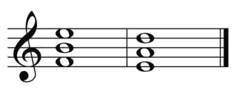 ? Écouter [Fiche]Cet accord peut être compris soit comme un accord de Mi mineur 7 suspendu (Em7sus4), soit comme un polyaccord :