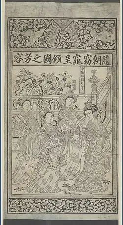 L'estampe du musée de l'Ermitage a été découverte en 1909 dans le Gansu. Elle représente, de gauche à droite, Ban Ji, Zhao Feiyan, Wang Zhaojun et Lu Zhu (morte en 300). Elles ont vécu sous la dynastie des Han, excepté Lu Zhu, qui a vécu sous celle des Jin. Une cartouche avec son nom surmonte chacun des personnages. L'estampe pourrait être datée entre les Song du Nord (960-1127) et les Song du Sud (1127-1279). Il s'agit probablement d'une image de nouvel an, destinée à être collée sur un mur. Ces images allant par paire, le pendant de celle-ci est perdu. Le cartouche horizontal de six caractères précise que l'estampe a été gravée par la maison Ji à Pingyang[2].