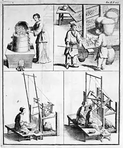 En Chine, l'élevage des vers à soie est à l'origine une activité réservé aux femmes, et de nombreuses femmes sont employées dans l'industrie de la fabrication de la soie[65]. Même si, malgré les précautions des autorités chinoises, la méthode de la production de soie se répand dans le reste du monde, la Chine de la dynastie Song réussi a conserver un quasi-monopole sur la fabrication. Ce grâce à une industrialisation à grande échelle de ladite production, par le biais du métier à tisser à deux personnes, de la commercialisation de la culture du mûrier et de la production en usine[66]. Certains auteurs ont comparé l'organisation du tissage de la soie dans les villes chinoises du XVIIIe siècle au système domestique utilisé dans les industries textiles européennes entre le XIIIe et le XVIIIe siècle. En effet, avec le développement du commerce interrégional de la soie, les maisons marchandes commencent à organiser la fabrication pour garantir leur approvisionnement, en fournissant de la soie aux ménages pour qu'ils la tissent et en les payant à la pièce[67].