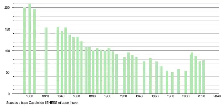 L'évolution du nombre d'habitants est connue à travers les recensements de la population effectués dans la commune depuis 1793. Pour les communes de moins de 10 000 habitants, une enquête de recensement portant sur toute la population est réalisée tous les cinq ans, les populations de référence des années intermédiaires étant quant à elles estimées par interpolation ou extrapolation[13]. Pour la commune, le premier recensement exhaustif entrant dans le cadre du nouveau dispositif a été réalisé en 2007[14].