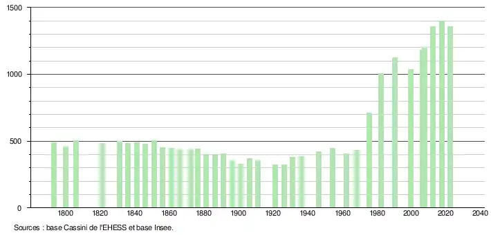 L'évolution du nombre d'habitants est connue à travers les recensements de la population effectués dans la commune depuis 1793. Pour les communes de moins de 10 000 habitants, une enquête de recensement portant sur toute la population est réalisée tous les cinq ans, les populations de référence des années intermédiaires étant quant à elles estimées par interpolation ou extrapolation[31]. Pour la commune, le premier recensement exhaustif entrant dans le cadre du nouveau dispositif a été réalisé en 2007[32].