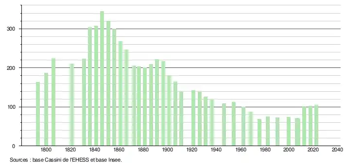 L'évolution du nombre d'habitants est connue à travers les recensements de la population effectués dans la commune depuis 1793. Pour les communes de moins de 10 000 habitants, une enquête de recensement portant sur toute la population est réalisée tous les cinq ans, les populations de référence des années intermédiaires étant quant à elles estimées par interpolation ou extrapolation[27]. Pour la commune, le premier recensement exhaustif entrant dans le cadre du nouveau dispositif a été réalisé en 2007[28].