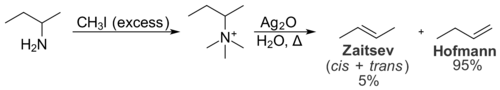 Les interactions stériques au sein du substrat peuvent également empêcher la formation du produit Zaïtsev. Ces interactions intramoléculaires sont pertinentes pour la distribution des produits dans la réaction d’élimination de Hofmann, qui convertit les amines en alcènes. Dans l'élimination de Hofmann, le traitement d'un sel d'iodure d'ammonium quaternaire avec de l'oxyde d'argent produit un ion hydroxyde, qui agit comme base et élimine l'amine tertiaire pour donner un alcène[11].