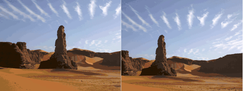 La photo de droite montre l'application de la règle des tiers. L'horizon se situe sur l'une de ces lignes séparant le tiers inférieur de la photo des deux tiers supérieurs. L'arbre se trouve à l'intersection de la ligne de tiers horizontale inférieure et de la ligne de tiers verticale de droite. Par exemple, la partie la plus brillante du ciel près de l'horizon ne tombe pas directement sur l'une des lignes, mais tombe près de l'intersection assez proche de deux des lignes, pour profiter de la règle.