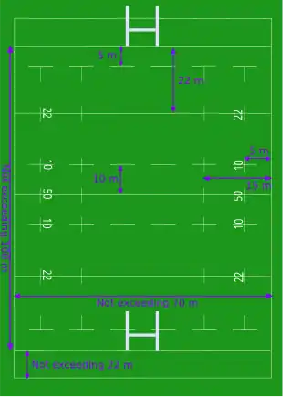 Un terrain de rugby est composé d'une surface généralement gazonnée d'une largeur maximale de 70 mètres et d'une longueur maximale de 144 mètres. Des lignes sont peintes en blanc à intervalles réguliers : la ligne de ballon mort, la ligne de but ou d'en-but, la ligne des 22 mètres (en référence à la ligne d'en-but), la ligne des 10 mètres (en référence à la ligne du milieu de terrain, aussi appelée la ligne de 40 mètres en référence à la ligne d'en-but), et la ligne de milieu de terrain. Ce schéma se répète sur l'autre partie du terrain. La distance maximale entre la ligne de ballon mort et la ligne d'en-but est de 22 mètres. La distance entre les deux lignes d'en-but, appelée « aire de jeu », est en général de 100 mètres, soit sa longueur maximale. Des lignes en pointillés sont également tracées à 5 mètres des lignes d'en-but et de touche ainsi qu'à 15 mètres des lignes de touche.