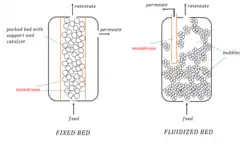 Parmi ces configurations, une plus grande attention ces dernières années, en particulier dans la production d'hydrogène, est accordée au lit fixe et au lit fluidisé : dans ces cas, le réacteur standard est simplement intégré avec des membranes à l'intérieur de l'espace de réaction[9].