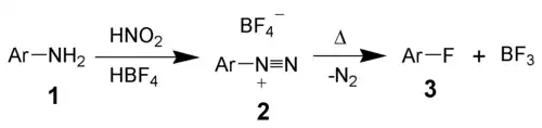 Le réactif initial est l'aniline (1) qui est transformée en sel diazonium par l'action de nitrite de sodium et d'acide chlorhydrique à basse température (<10 °C)[2]. Le sel est soluble dans l'eau. L'ajout d'acide fluoroborique ou d'une solution de tétrafluoroborate de sodium conduit à la formation du tétrafluoroborate d'arènediazonium (2) qui précipite. Le solide est filtré, lavé à l'éthanol, puis séché. L'élimination des traces de chlorure de sodium est importante pour éviter la formation ultérieure de chlorobenzènes et le séchage pour éliminer l'eau dont la présence peut conduire à la formation de phénol[2].