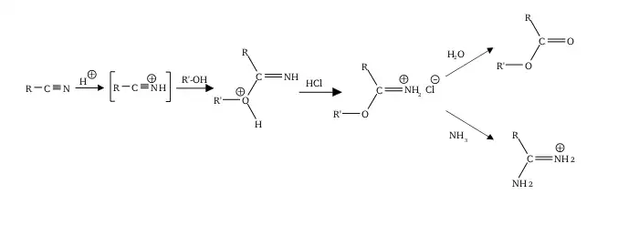 - ↑ (de) A. Pinner et F. Klein, « Umwandlung der Nitrile in Imide », Ber. Dtsch. Chem. Ges., vol. 11, no 2, , p. 1475–1487 (ISSN 0009-2940, DOI 10.1002/cber.18780110258, lire en ligne).