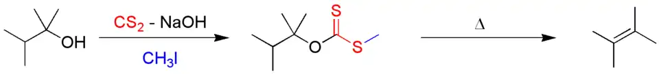 À une température d'environ 200 °C, l'alcène est ensuite formé par élimination interne : au sein d'un état de transition hexacyclique, l'atome d'oxygène du xanthate arrache l'hydrogène du carbone β dans un processus d'élimination syn. Le produit secondaire ainsi obtenu se décompose en oxysulfure de carbone (OCS) et en méthanethiol.